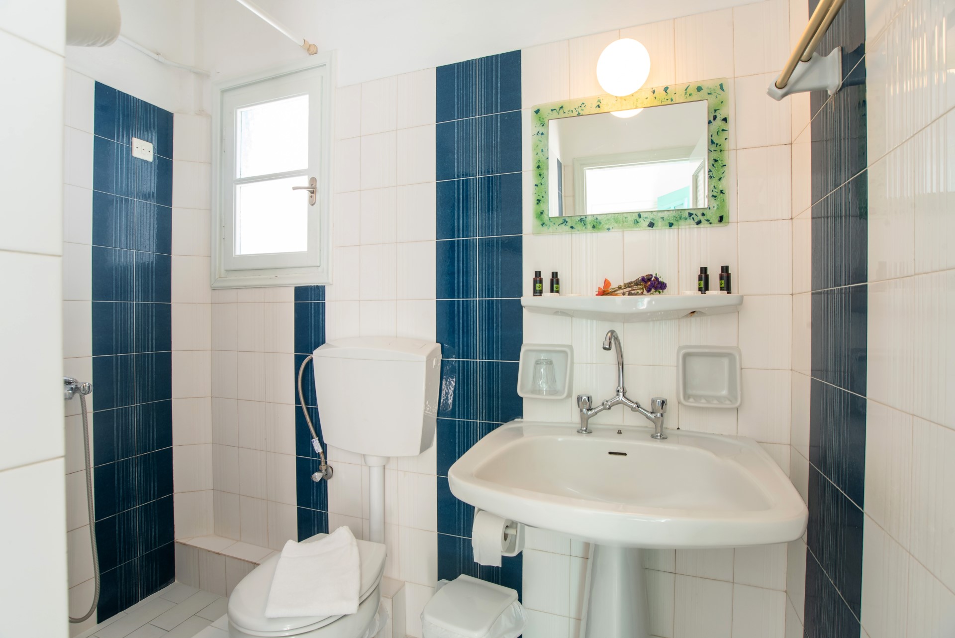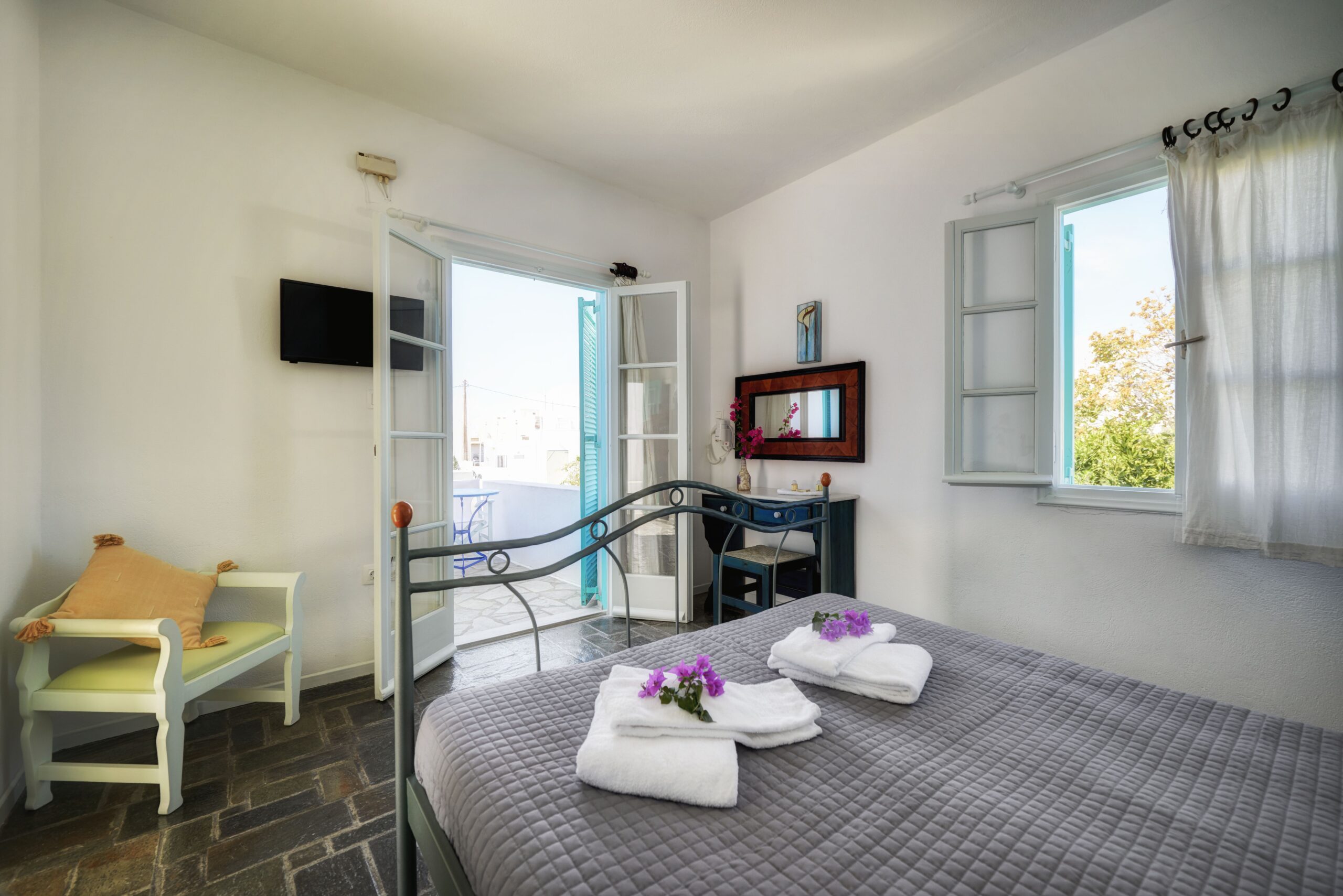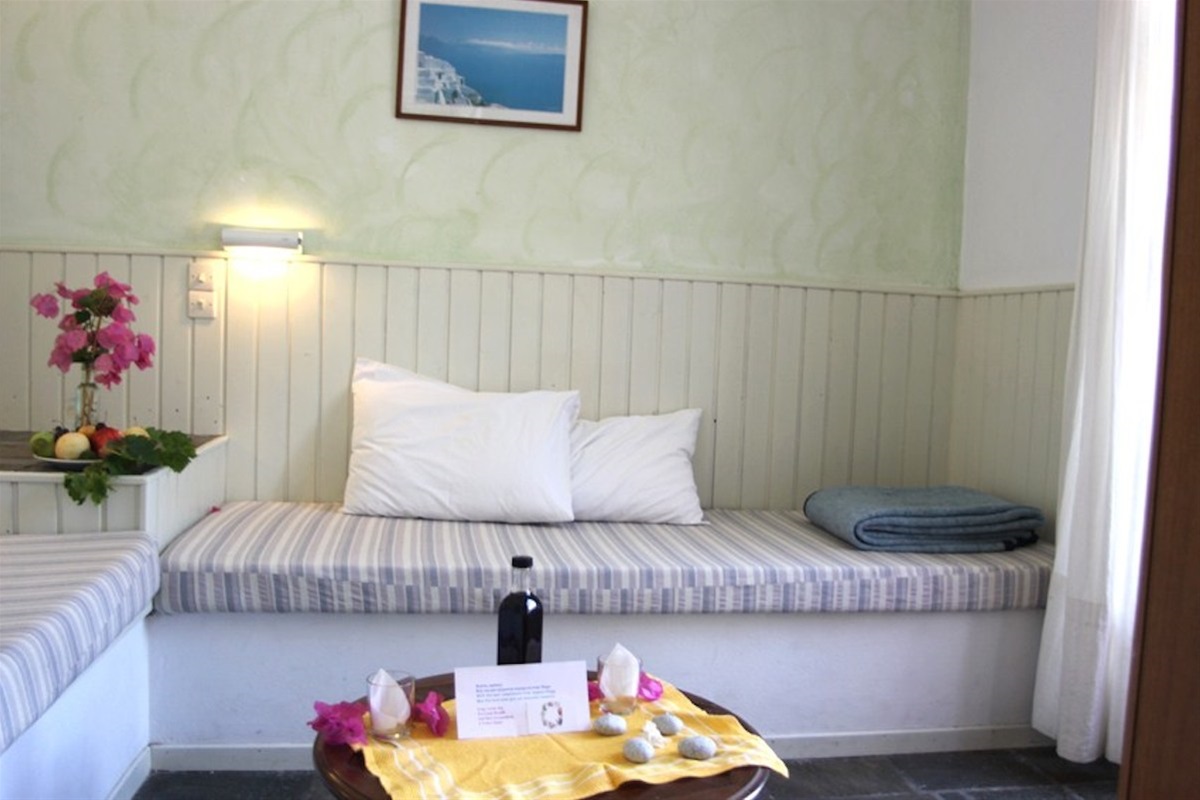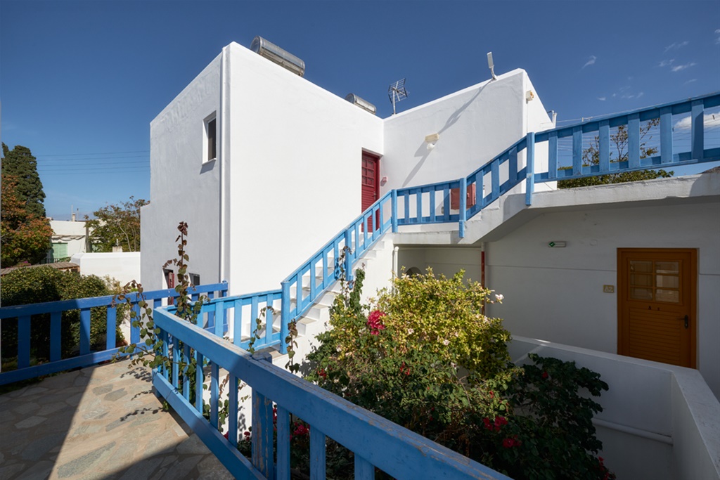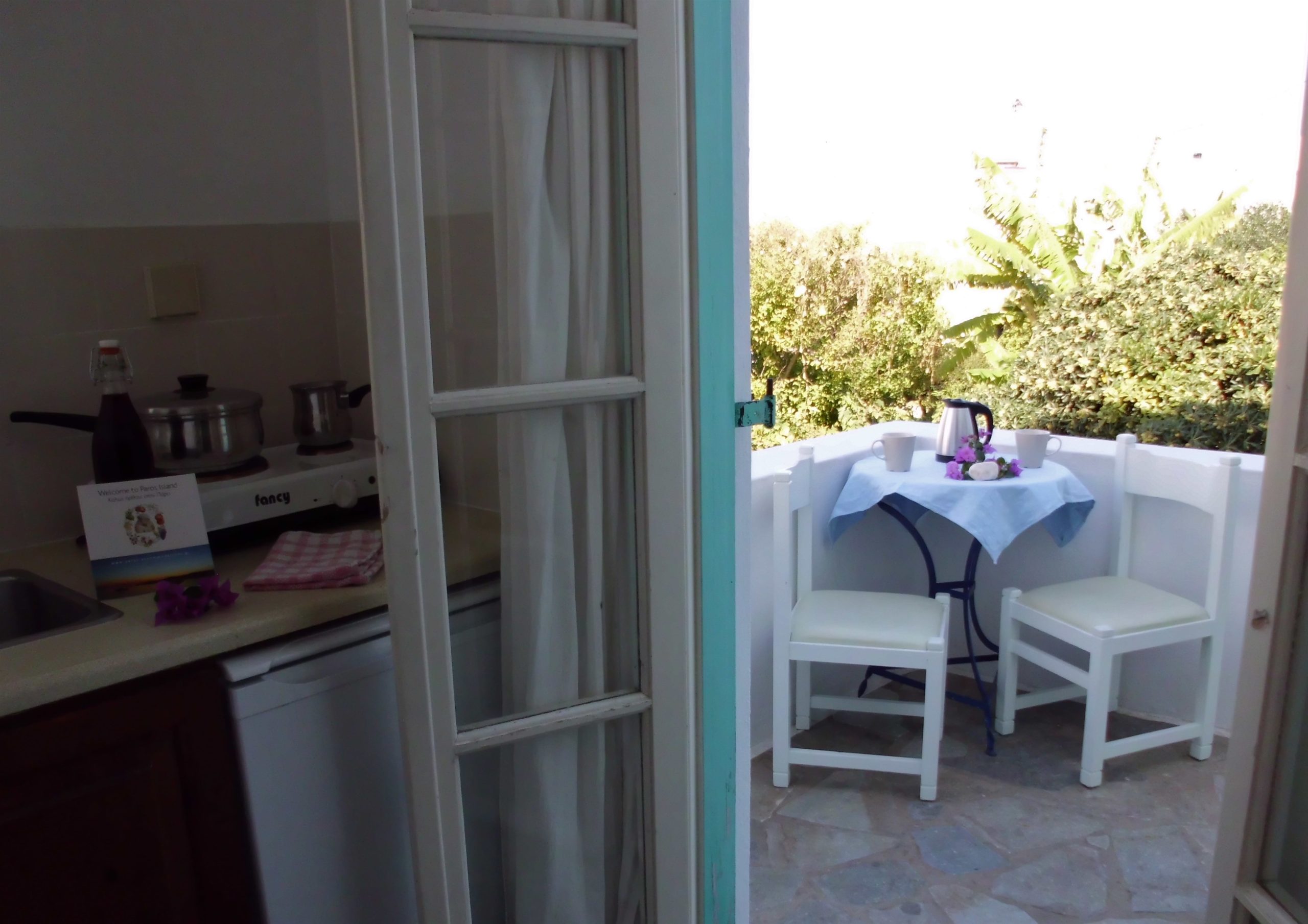 The Apartments about 45m² include private WC/Shower and balcony or veranda opening onto the courtyard features a living room with built-in sofa/beds, small kitchenette with dining table and refrigerator, safety box, Wi-Fi free of charge. The 5th Guest sleeps on an extra folder bed.